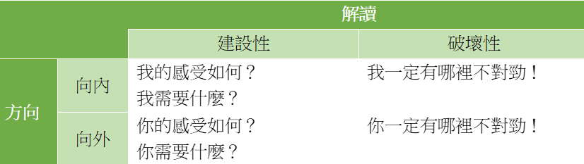• 向外的建設性解讀:你的感受如何﹖你需要什麼﹖
